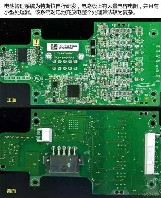 電池管理系統主要功能包括數據采集、電池狀態計算、能量管理、熱管理、安全管理、均衡控制和通信功能等。從電路圖上可看到,電池管理系統為特斯拉自行研發,擁有高度的知識產權的核心技術。該系統能自行處理充放電以及發熱問題。相信國內廠商較難山寨出來。